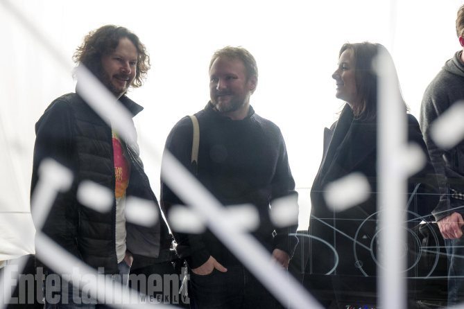 Star Wars: The Last JediL to R: Producer Ram Bergman, Director Rian Johnson, and Producer Kathleen Kennedy on set