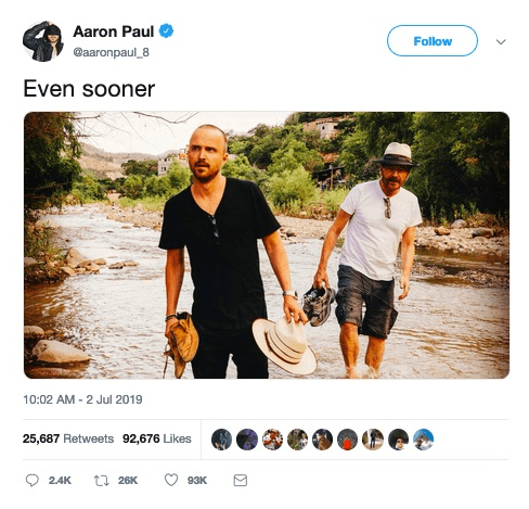 Fans tycks dock vara förvirrade kring hur comebacken ska gå till. Det mest logiska är att de syns till i Better Call Saul eftersom man då skulle följa Walter och Jesse i början av deras olycksaliga äventyr. Men om comebacken kommer i filmen, så måste det betyda att bilden på Twitter antingen visar en tillbakablick – eller att Walter överlevt.