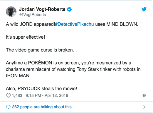 Inför premiären av Detective Pikachu har Kong: Skull Islands regissör Jordan Vogt-Roberts sett filmen och menar att filmen tog luften ur honom, i positiv mening. Han påstår att den även bryter tv-spelfilmens förbannelse. Han hintar också om att den berömda pokémon-figuren Psyduck kommer att vara en av filmens bästa ingredienser. Läs hans tweet om filmen: