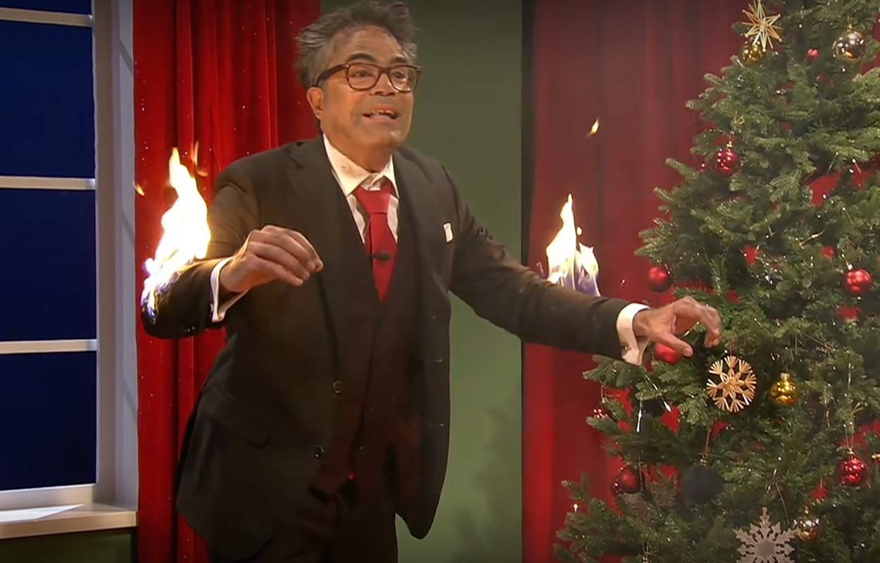 I ett inslag under SVT:s julsändning sker något oväntat. Värden David Batra råkar tända eld på studion och fumlar runt i en lång slapstick-sekvens.